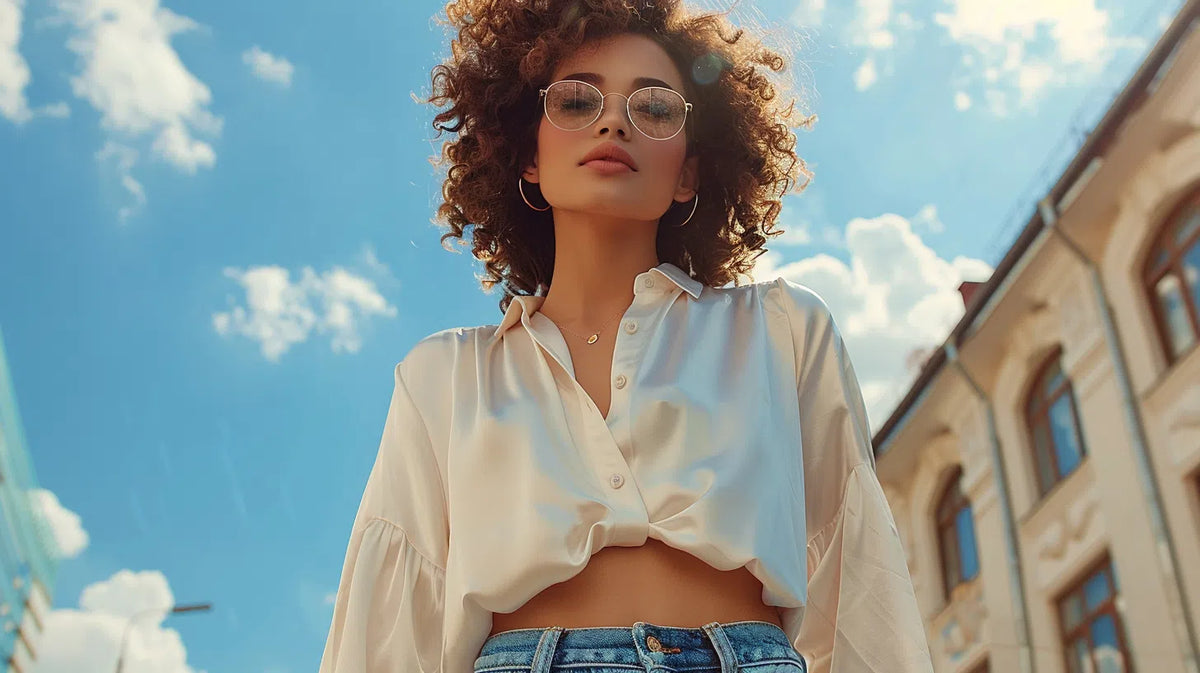 Trendsetting woman in high-waisted denim shorts with pastel blouse, outdoor setting. Spring season.