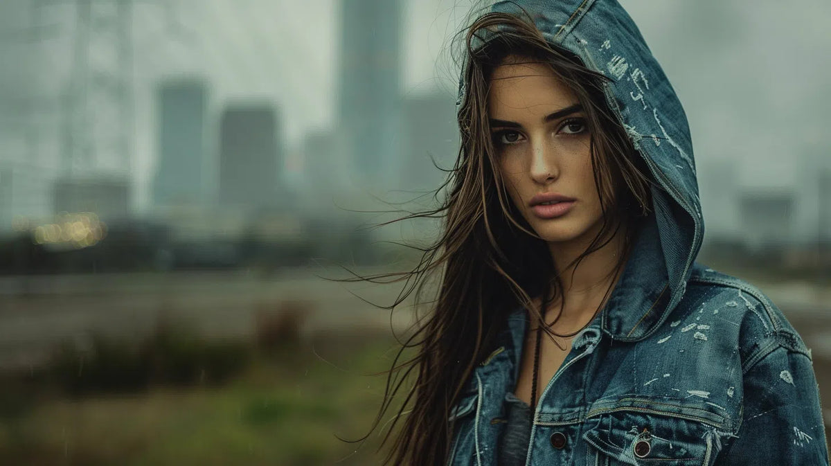 Female model in denim hooded jacket, urban chic, outdoor city backdrop. Spring season.